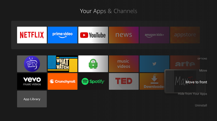 Looks like 3 horizontal lines over one another. That will bring up a small menu on the right side of the screen. Scroll down to the "move to front" option and select it and press enter. This will move your app to the front of your apps for easy access.